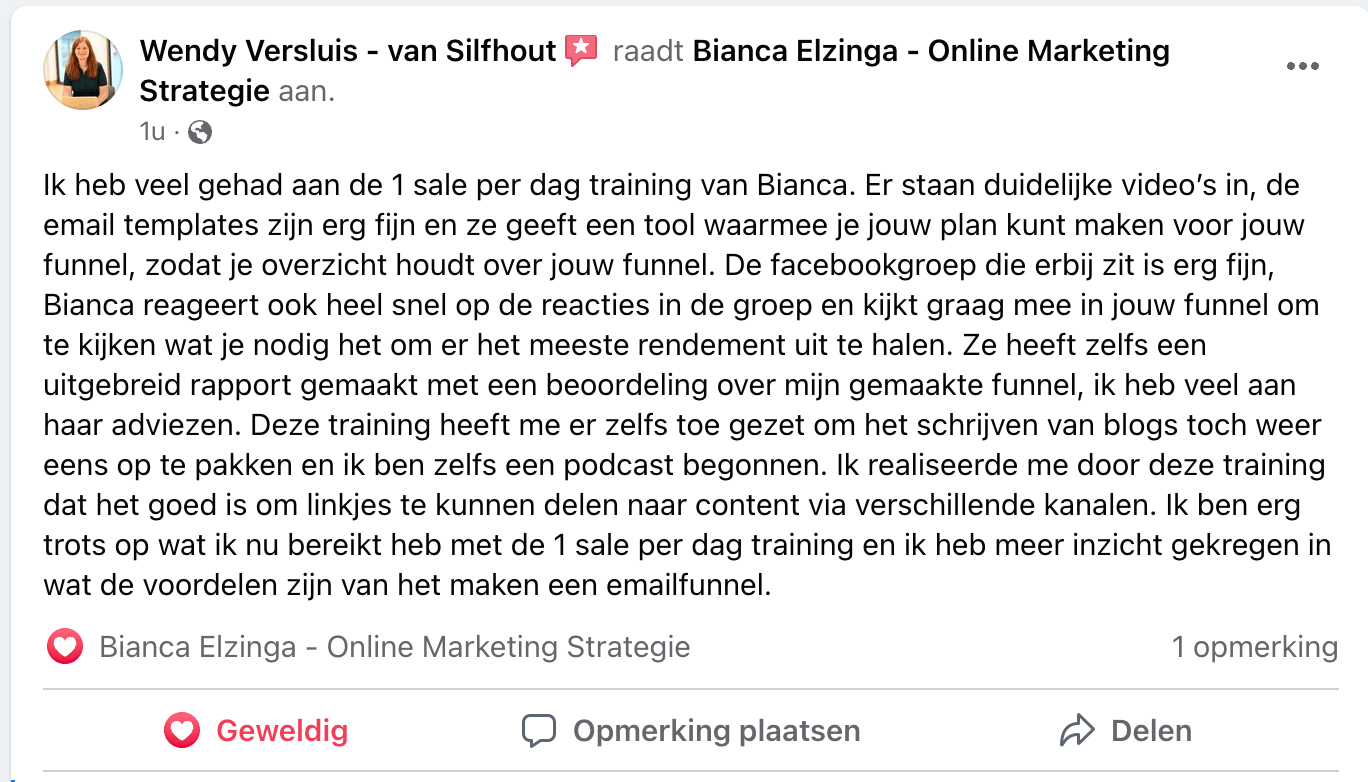 “Ik stapte in de Funnel Bootcamp met de 1 Sale per Dag cursus bij Bianca toen ik vlak voor de lancering van mijn boek stond. Gekoppeld aan mijn boek wilde ik een boekfunnel maken en nadat ik via 2 tevreden klanten van Bianca bij haar terecht was gekomen, ben ik aan de slag gegaan.