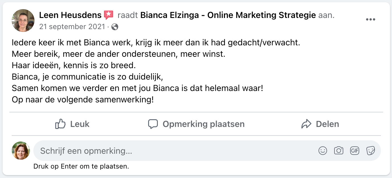 “Ik heb heel fijn met Bianca samengewerkt. Tijdens onze gesprekken kwam ze altijd weer met nieuwe ideeën en inzichten, die mijn processen konden verbeteren. Veel van haar advies kwam ook ten goede van de strategie van mijn bedrijf; Bianca zag altijd wel ergens een mooie nieuwe kans, die ik nog niet gezien had. Bianca is rustig, waardoor ik -druk als ik ben- ook weer meer de rust kon vinden. Ze is behulpzaam, gaf mij als klant het gevoel dat ik belangrijk ben en ging altijd net een stapje verder als wat ik verwachtte. Ik zou het zeker aanraden om met Bianca te werken!”