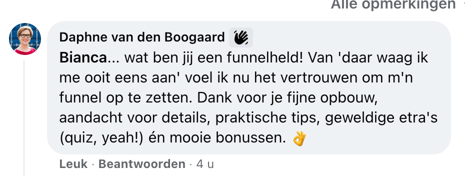 ‘Er wordt veel geschreven over funnels, maar als je echt het beste uit je funnel wilt halen, dan is er meer nodig dan een reeks e-mailtjes. En dat ‘meer’, dat levert Bianca! Ze beschikt naast een enorme berg kennis, vooral ook over een onuitputtelijke bron van gave ideeën. Bianca denkt echt bewust mee over je bedrijf en ziet altijd net de oplossing die je zelf niet (meer) ziet. En zo ontstaat er een funnel die zijn weerga niet kent. En daarnaast is het ook nog eens een hartstikke leuk mens. Win-win dus.’